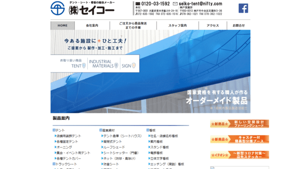 テントやシートの総合メーカーとして、テントはもちろん防音、不燃シートやメッシュシート、鳥除けネット、カーテンなどを製造しています。イベントに使うテントや、トラックの荷物を保護するシートなども手がけています。テント倉庫には、シートを使ったシャッターを設置することも可能。スチールシャッターよりも高速な開閉ができて、物流を妨げず効率化が可能です。